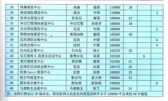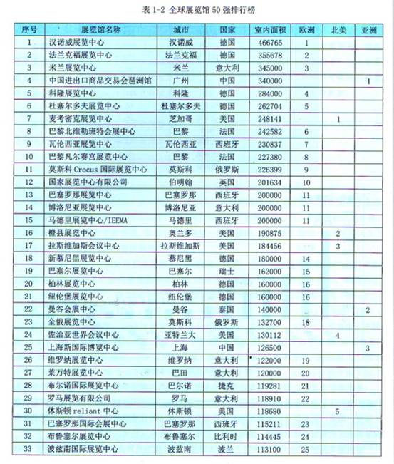 室內(nèi)展覽面積在10萬平方米以上的特大場館,已經(jīng)成為世界會展國力的標志。根據(jù)A UMA數(shù)據(jù),2 011年室內(nèi)展覽面積1 0萬平方米以上的特大型場館,即最具競爭力的全球展館50強(實際列入的展館為49個)中,新增了沈陽國際展覽中心和倫敦艾克塞爾展覽中心,展館面積總計達到820.53萬平方米,主要分布在全球46個城市。其中,歐洲35個展館,分布在11個國家;亞洲8個展館,分布在中國、新加坡和泰國;北美6個展館,全部在美國。