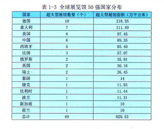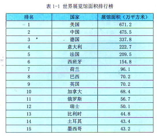 以展館面積大小排序,2013年世界展覽館十大國家為:美國第一,671. 2萬平方米;中國第二,475.5萬平方米;德國第三,337 .8 萬平方米;意大利第四,222.7萬平方米:法國第五,209. 5萬平方米:西班牙第六154.8萬平方米;荷蘭第七,.96 .1萬平方米;巴西第八.70. 2萬平方米;英國第九.70 .2萬平方米;加拿大第十,68.4萬平方米。其他還有俄歲斯(56. 7萬平方米)、瑞士(50.1萬平方米)、比利時(44. 8萬平方米)、土耳其(43.4萬平方米)、墨兩哥(43 2萬平方米),這15個國家的展館占全球展覽面積的80%。其中,美國、中國、德國、意大利和法國,這前五強國家的展館面積更是達到全球60%以上。