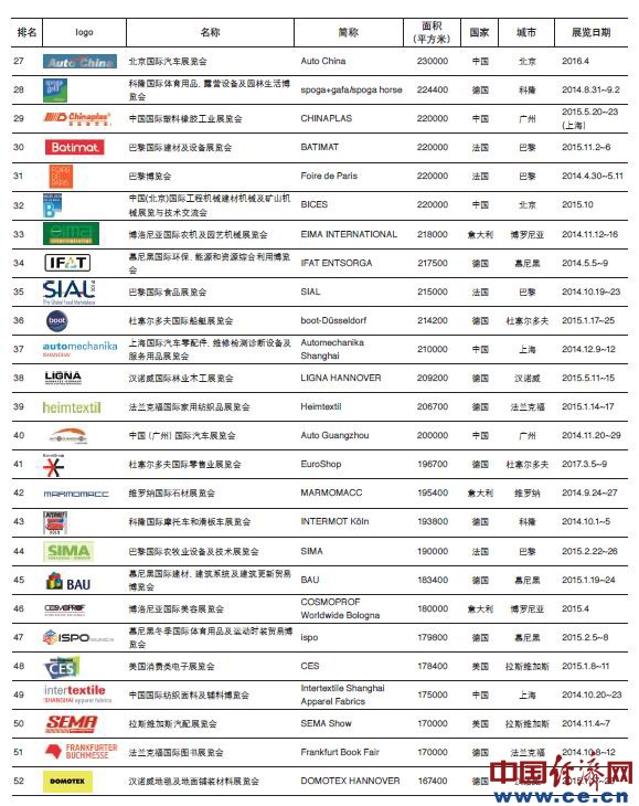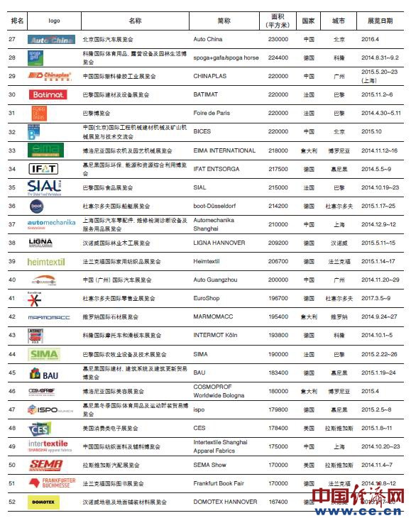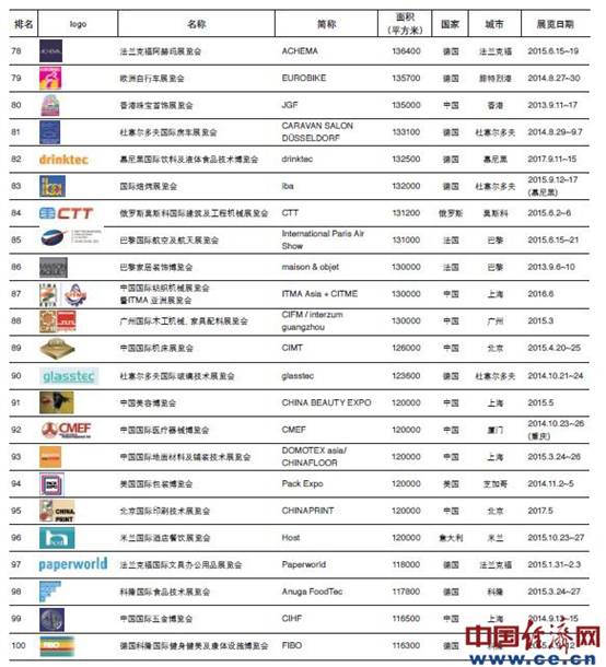 前不久,由《進(jìn)出口經(jīng)理人》雜志社主辦的2014進(jìn)出口經(jīng)理人年會(huì)暨中國(guó)外貿(mào)市場(chǎng)報(bào)告發(fā)布會(huì)在京舉行。會(huì)上發(fā)布了2014年世界商展100大排行榜,榜單顯示,100大中的中國(guó)展覽平均面積均低于平均面積,但發(fā)展迅猛,這顯示出雖然中國(guó)展覽還遠(yuǎn)未占據(jù)主導(dǎo)地位,但擴(kuò)張迅速,為全球商展發(fā)展貢獻(xiàn)強(qiáng)勁動(dòng)力?,F(xiàn)在,畢加展覽小編就跟大家聊一聊,我們先看這份排名: