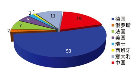 德國(guó)作為世界大型商展的主導(dǎo)力量至今無(wú)人能撼,但發(fā)展速度略低,在2013年世界商展100大排行榜中,德國(guó)展覽超過(guò)半數(shù),達(dá)到53席。中國(guó)比上年再增1席,從18席增加到19席,為鞏固中國(guó)在世界展覽中第2大陣營(yíng)的地位又添一磚。美國(guó)也從危機(jī)中復(fù)蘇,在100大榜中從4席增加到5席。榜單中其他國(guó)家均保持了自己的地位:法國(guó)8席、俄羅斯2席,瑞士2席、西班牙1席,見(jiàn)圖1。
