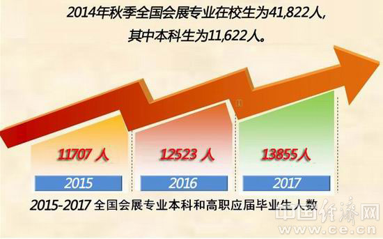 根據(jù)最新統(tǒng)計,2014年我國會展教育保持較快發(fā)展勢頭,全國招收會展新生14293人,較上年增加10.2%。新生入學(xué)后,全國會展專業(yè)在校生規(guī)模達(dá)41822人,創(chuàng)歷史最高水平。2015-2017會展專業(yè)