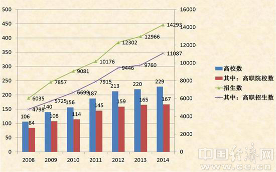 圖2. 歷年開設(shè)會展專業(yè)院校數(shù)和招生數(shù)變化情況(2008-2014)