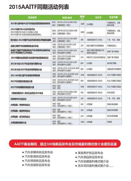 國際汽車改裝服務(wù)業(yè)展覽會(AAITF)于2006年創(chuàng)辦,憑借豐富的行業(yè)積累、精準的展會定位及全面的推廣渠道,成為中國汽車后市場全產(chǎn)業(yè)鏈唯一的全球貿(mào)易平臺。秉承往年的豐碩成績,2015年1月16-18日于深圳會展中心將盛大續(xù)辦的AAITF 2015 深圳展,大會以“品牌、科技、環(huán)保”為主題,展出面積達22萬平米、8,000個展位、9個館精確分館分區(qū),匯聚全球500強企業(yè)及國內(nèi)3,000余家主流品牌企業(yè)總部直接參展,20,000新品全球首發(fā),一系列高規(guī)格同期活動連番上演,預(yù)計吸引全球超過90個國家及地區(qū)的28萬來自汽車后市場全產(chǎn)業(yè)鏈優(yōu)質(zhì)買家和專業(yè)觀眾齊聚一堂、共襄盛會。