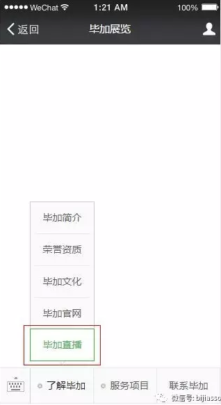 方式一,關(guān)注我們畢加展覽的微信公眾號:bijiasso,關(guān)注后進(jìn)入平臺,左下方有個畢加直播,點擊可觀看,如下圖