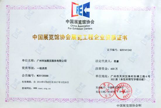 為了適應(yīng)中國展覽業(yè)快速發(fā)展的形勢,應(yīng)對國際展覽業(yè)的競爭與合作,進(jìn)一步規(guī)范市場,提高展覽工程的技術(shù)和施工水平,確保展覽工程的質(zhì)量和安全,推動(dòng)行業(yè)進(jìn)步與繁榮,中國展覽館協(xié)會(huì)特制定展覽工程企業(yè)暨展覽場館工程部門資質(zhì)等級。經(jīng)過層層的審批畢加展覽榮獲“中國展覽館協(xié)會(huì)一級資質(zhì)”的最高等級榮譽(yù)。