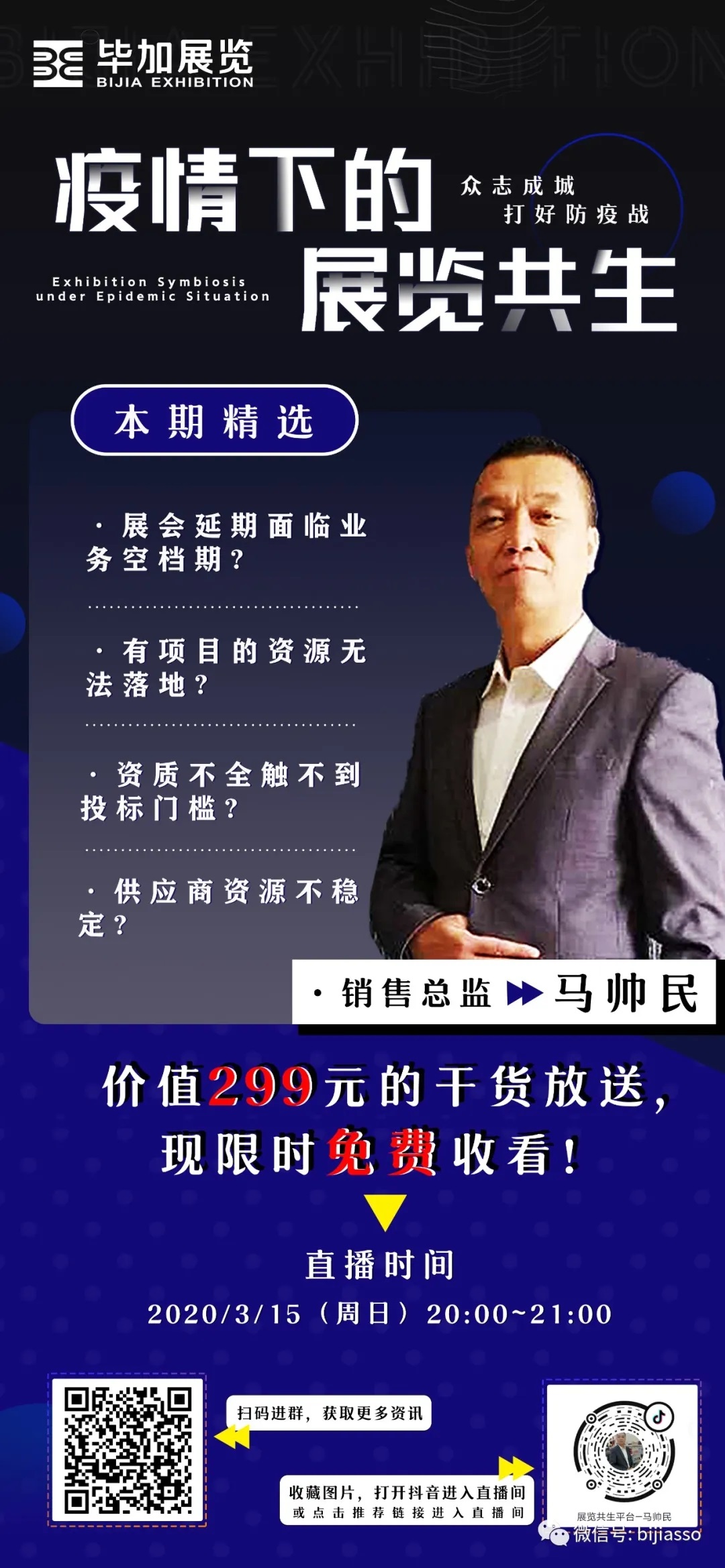 時間將于2020年3月15日(周日)晚上8點到9點,在抖音平臺為大家直播講解行業(yè)問題,歡迎各位展覽行業(yè)的老板共同參觀。