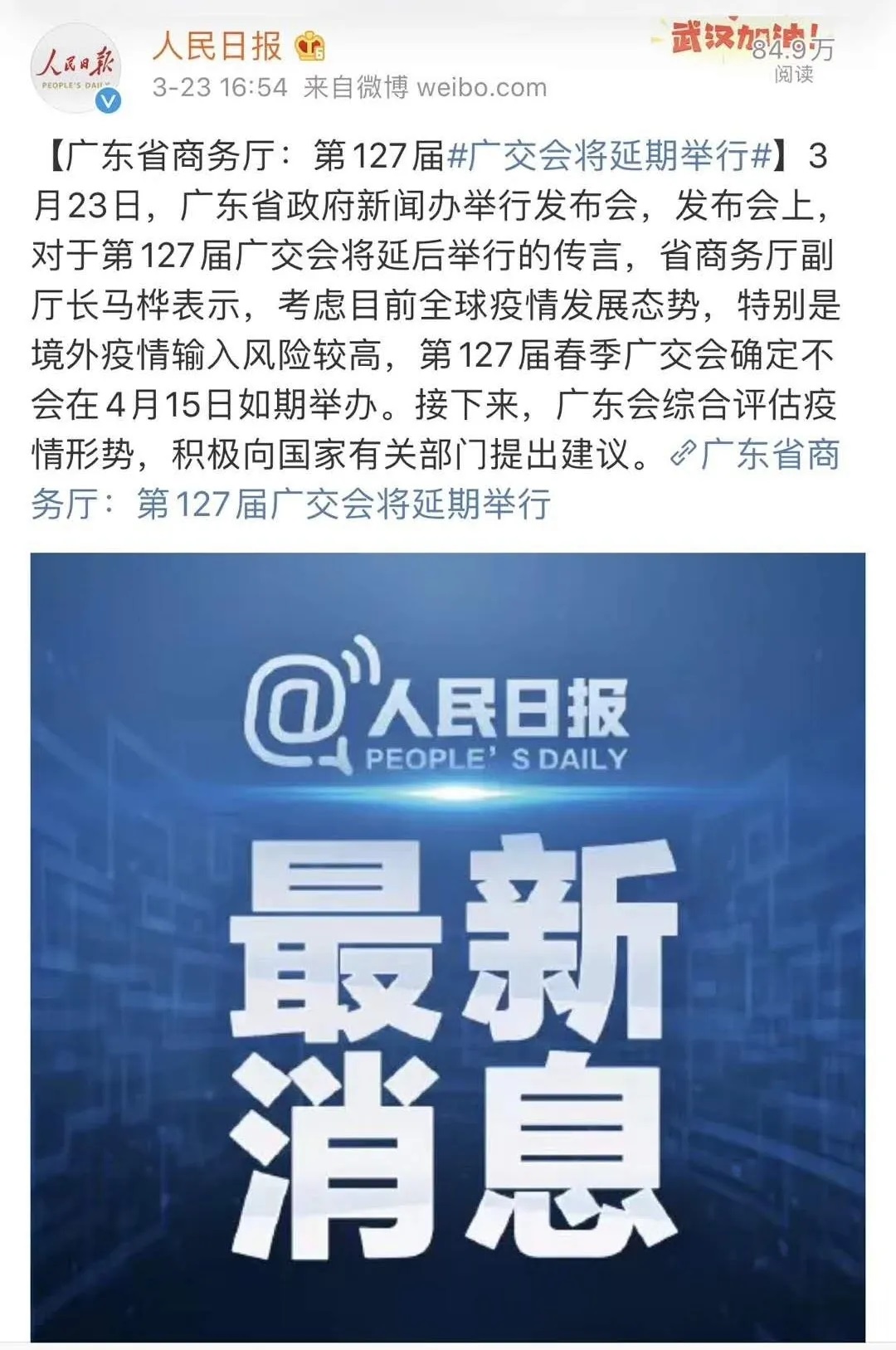 最新訊息!廣交會延期舉行,將取消原定4月15日舉辦