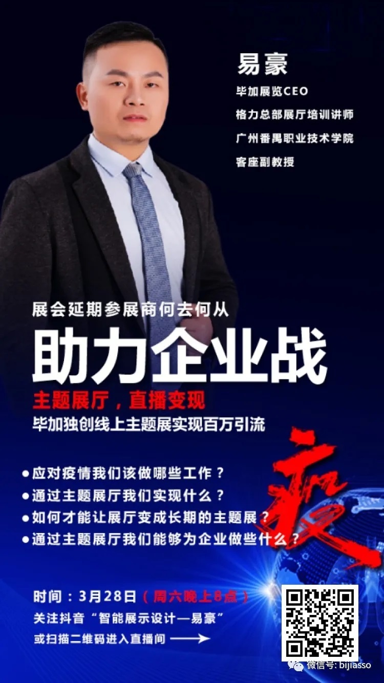 易豪:畢加展覽總裁,曾為格力總部進(jìn)行展廳課程培訓(xùn),現(xiàn)任廣州番禺職業(yè)技術(shù)學(xué)院客座副教授。疫情的破壞性對(duì)于展廳項(xiàng)目來(lái)說,影響并不算很嚴(yán)重,展廳項(xiàng)目依然可以照舊進(jìn)行。