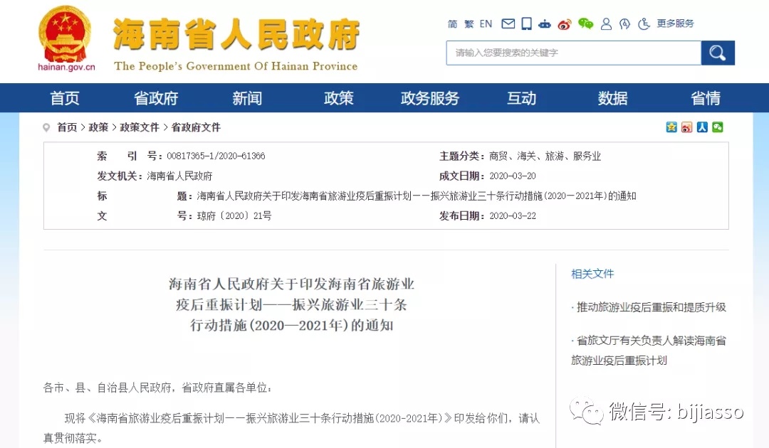 海南省人民政府關(guān)于印發(fā)海南省旅游業(yè)疫后重振計(jì)劃——振興旅游業(yè)三十條行動措施(2020—2021年)的通知