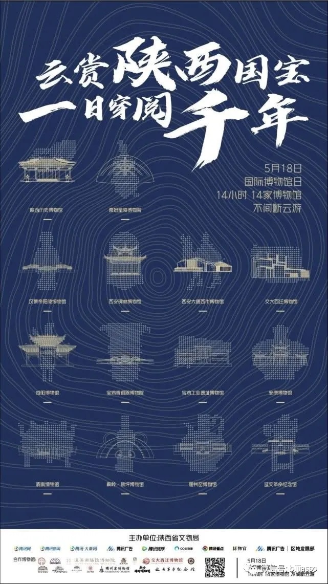 另外,陜西省文物局聯(lián)合騰訊大秦網(wǎng)、騰訊看點(diǎn)推出“云賞陜西國(guó)寶·一日穿閱千年”的云游活動(dòng),邀請(qǐng)14家陜西省最具代表性的博物館,在5月18日當(dāng)天8點(diǎn)至22點(diǎn)“輪番上陣”,帶領(lǐng)網(wǎng)友一起穿越周、秦、漢、唐四個(gè)朝代,共賞陜西國(guó)寶(具體的云游時(shí)間表請(qǐng)關(guān)注“云賞陜西國(guó)寶·一日穿閱千年”活動(dòng))。