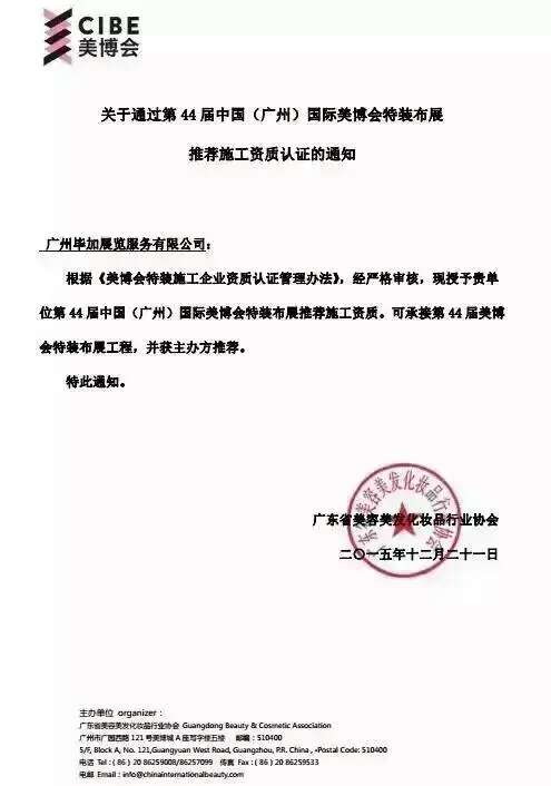 喜大普奔,畢加展覽榮獲第44屆中國(廣州)國際美博會特裝布展推薦施工資質(zhì),并獲主辦方推薦!畢加展覽經(jīng)過十二年的美博會展臺設(shè)計搭建洗禮,又一次獲得了美博會施工資質(zhì),有圖有真相:
