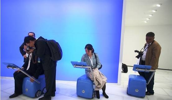 在寶馬MINI Cooper的展位中,其形象體驗(yàn)區(qū)中有兩個(gè)互動(dòng)體驗(yàn)式設(shè)計(jì),一個(gè)是自助式的拍照打印展臺(tái)觀眾可以通過(guò)觸摸屏自由選取MINI車(chē)的顏色、花紋和附加裝備,然后拍攝十張大頭貼并選取一張最滿意的打印出來(lái)。小編不知道這套系統(tǒng)的后面是否有數(shù)據(jù)統(tǒng)計(jì)的功能,但是如果針對(duì)參與觀眾的特點(diǎn)和選擇進(jìn)行數(shù)據(jù)統(tǒng)計(jì)和分析的話,無(wú)疑是一舉兩得進(jìn)行一次隱蔽的市場(chǎng)調(diào)查的好辦法。另一個(gè)是踏板游戲機(jī),觀眾可以在上面完成躲避路障的游戲。為了防止參與觀眾過(guò)多造成場(chǎng)地?fù)頂D,兩個(gè)互動(dòng)區(qū)域距離很遠(yuǎn),中間通過(guò)紀(jì)念品展示區(qū)和觀眾休息區(qū)連接。