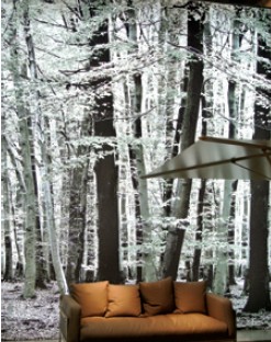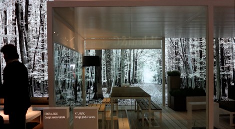 2012年米蘭家具展某戶外家具品牌則大膽采用噴繪作為整個展廳的主背景,且效果甚佳。我們發(fā)現(xiàn),在其三面開敞的展位上,僅有一個背景墻,設(shè)計師將其全部覆蓋噴繪布。在這個以森林為場景的噴繪中,意大利人對角度的選取、對光線的處理以及對色彩的拿捏十分完美。一方面茂密的森林很好營造出戶外的意境,給人逼真的視覺效果,另一方面灰白的色調(diào)處理將背景與家具的層次有效拉開,背景的陪襯作用恰到好處,戶外家具的主體地位得到凸現(xiàn),主次分明、虛實(shí)結(jié)合。