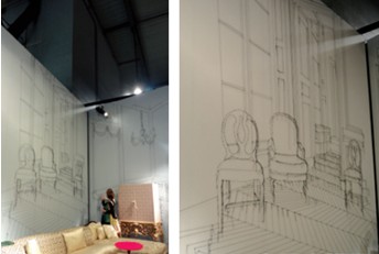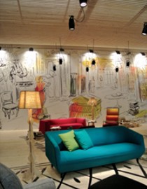 這是一家做現(xiàn)代風(fēng)格布藝沙發(fā)的品牌,整個展廳的背景均通過墻面的繪畫來表達(dá)。試想在中國,同樣的布藝沙發(fā),我們往往會通過豪華的裝修來營造各式客廳空間,休閑的、都市的、田園的等等,以及各種復(fù)雜的吊頂、背景墻、吊燈、裝飾畫、織物來配合。不僅花費(fèi)較高,場景的靈活多變性也十分受限。米蘭展上的這家現(xiàn)代布藝沙發(fā)的展廳給了我們一個全新的思維,以繪畫手法做出的背景墻簡單而實(shí)用,更可貴的是,簡單的線條和輕松的色 塊將布藝沙發(fā)所倡導(dǎo)的閑適、自在、追求浪漫的生活態(tài)度一并呈現(xiàn)在了我們面前。